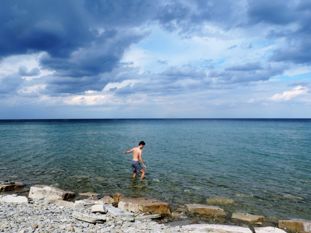 Après le pique-nique, nous quittons Collingwood pour rejoindre la péninsule Bruce. Chaque fois que possible, nous optons pour les petites routes, itinéraires buissonniers, qui longent la baie. Malheureusement, le panorama sur le lac est rarement dégagé. Les arbres sont partout… et surtout, les bords de lac sont une succession de parcelles privées construites de chalets plus ou moins luxueux qui, eux, ont une vue magnifique ! Nous trouvons tout de même un accès (il s’agit d’un petit parc mémorial aménagé) à une plage où nous pouvons savourer une nouvelle baignade sous un ciel qui annonce l’orage.