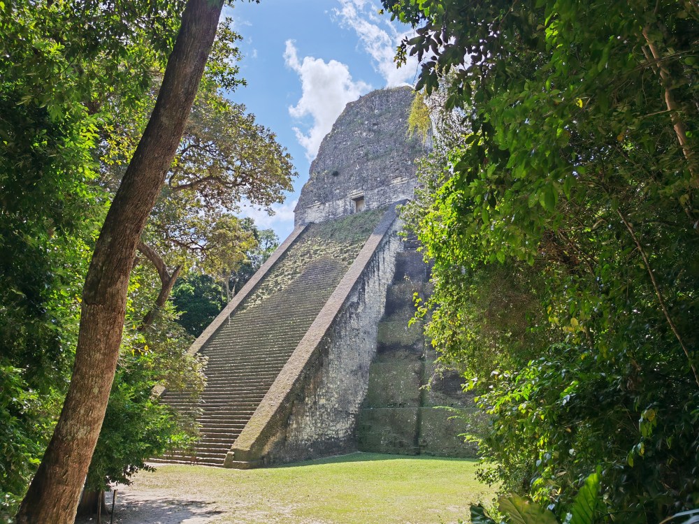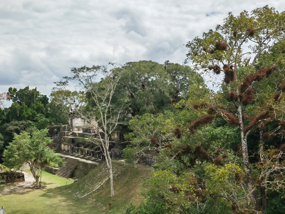 Le lendemain, nous partons à l’assaut des fameuses pyramides de Tikal. Les Mayas devaient avoir des mollets en béton vu la hauteur des marches rapportée à la taille moyenne de la population !! Aujourd’hui, heureusement, on ne grimpe pas à même les pierres historiques mais avec des escaliers en bois spécial touristes (c’est raide tout de même !). La vue sur la canopée est magnifique, avec les temples qui dépassent çà et là et, si on est chanceux, le show des singes araignées qui sautent d’arbres en arbres.