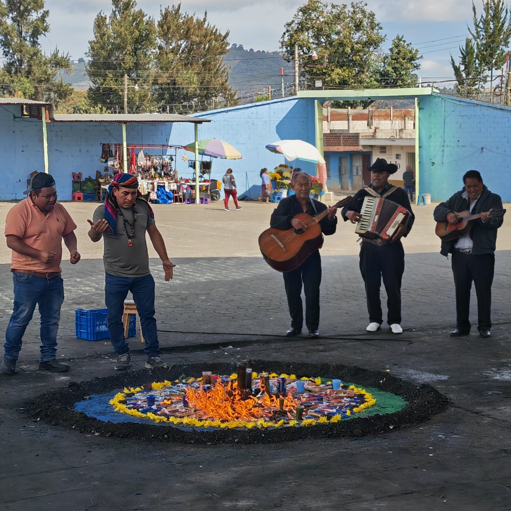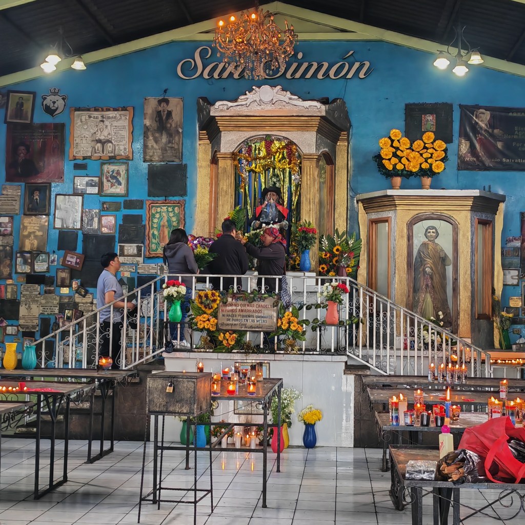 En minibus, nous mettons le cap sur San Andrès Itzapa situé à environ 1850 m d’altitude. Notre premier arrêt est consacré à la visite du Temple dédié à San Simon ou Maximon (prononcer Machimon) un symbole du syncrétisme guatémaltèque entre croyances maya et religion catholique. Selon les régions, Maximon est un grand père ou un grand frère auprès de qui on vient solliciter assistance et bénédiction pour une grande diversité de situations : guérir d’une maladie, susciter l’amour, réussir dans les affaires, émigrer aux Etats Unis, acheter une voiture… Pour cela, les fidèles viennent de loin, parfois des pays voisins, pour réaliser un rite d’offrandes aussi diverses que des cigarettes, du rhum, de la nourriture, des fleurs et des bougies. L’ensemble est disposé savamment en cercle avant d’être brûlé parfois au son de la musique d’un groupe de Mariachis. C’est assez impressionnant !