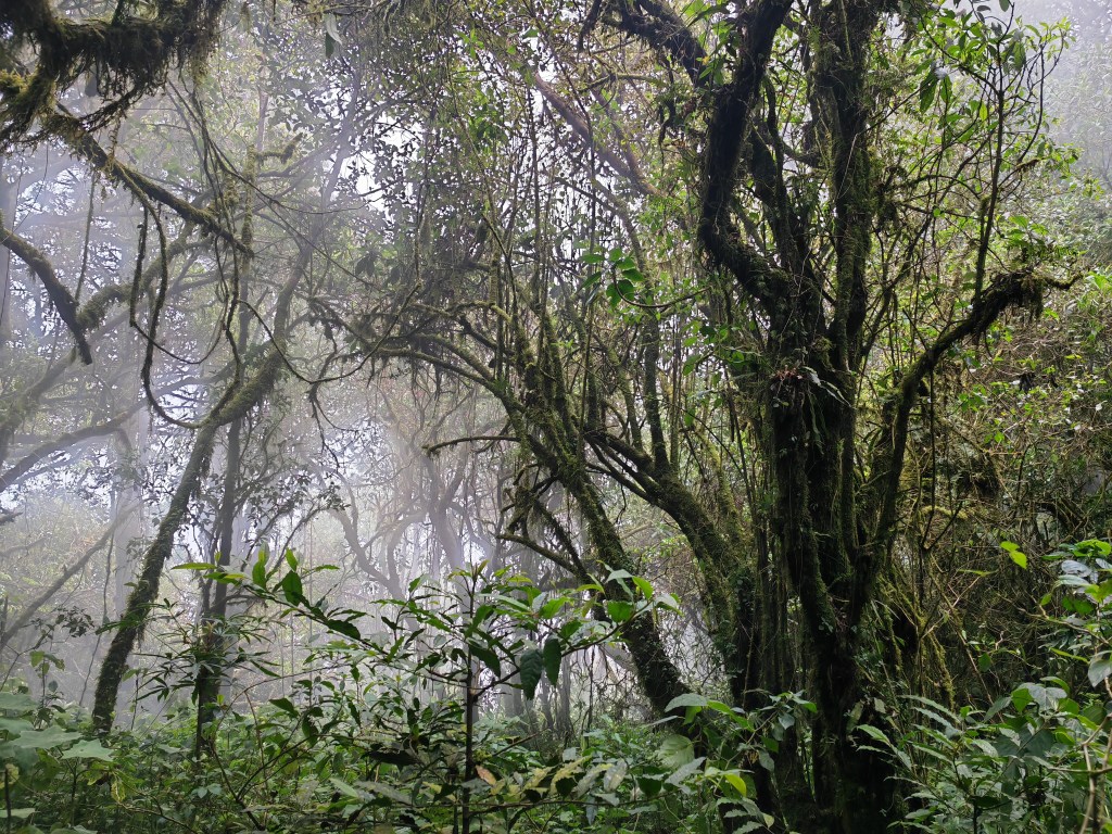 Nous entrons dans la « forêt de nuages », la brume monte (ou descend ?!), et donne au paysage une drôle d’allure fantomatique. Le chemin est encore long jusqu’au camp et la descente est raide. Pas fâchée d’arriver enfin sur le terrain de foot où Juan Carlos (el jefe) et Patricio (le chef… cuisinier) ont installé le camp (juste à côté du cimetière et, plus dérangeant, d’une route assez passante).