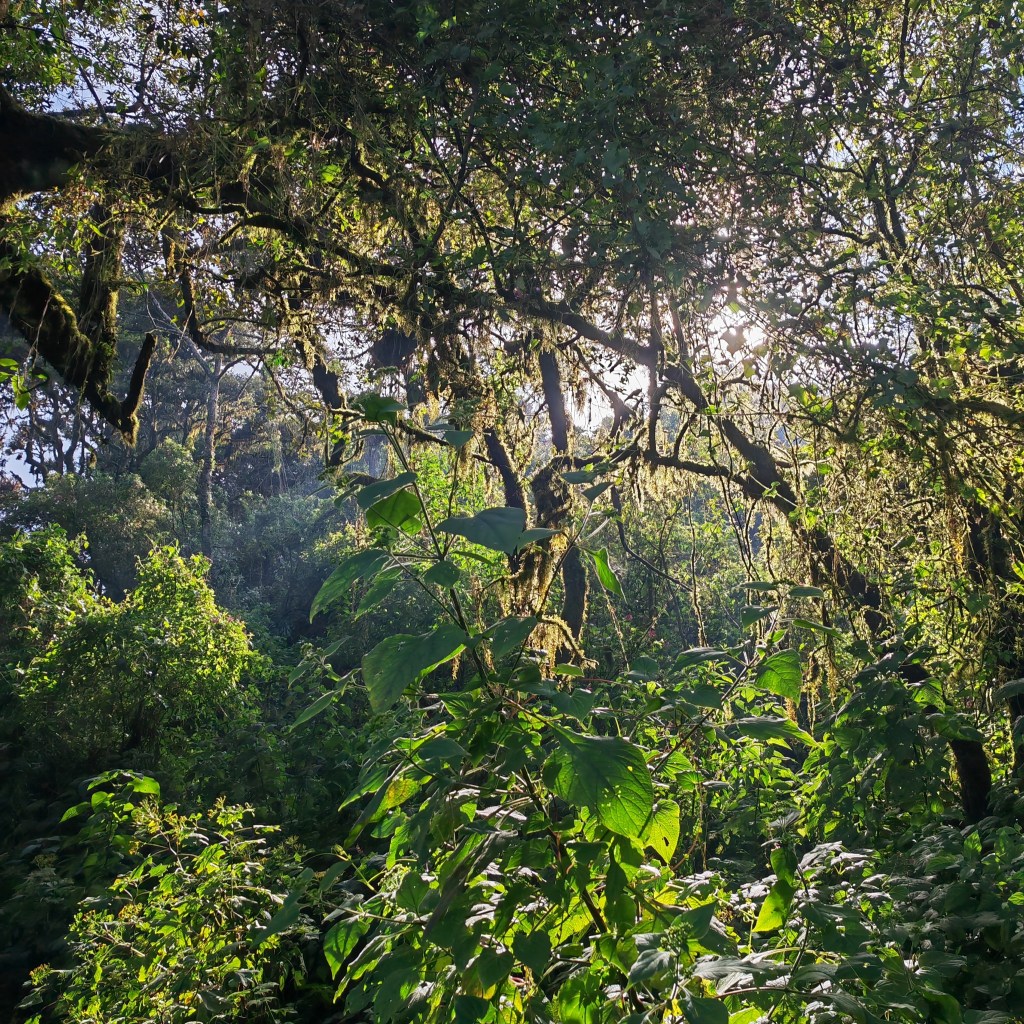 Le chauffeur nous dépose ensuite sur les hauteurs après le petit village de Chicasanga. C’est le début de notre marche ! La petite route se transforme progressivement en piste, puis en sentier, hésitant entre champs de choux et forêt dense. Nous nous élevons petit à petit accompagnées par un paysan en route vers sa parcelle qui tient à partager avec nous son histoire de clandestin aux Etats Unis pendant plusieurs dizaines d’année. Il a 45 ans, il en paraît 60 !