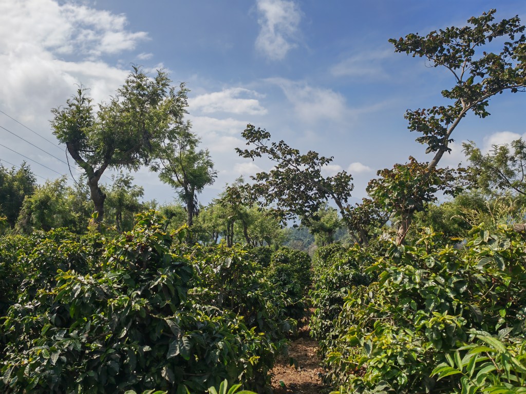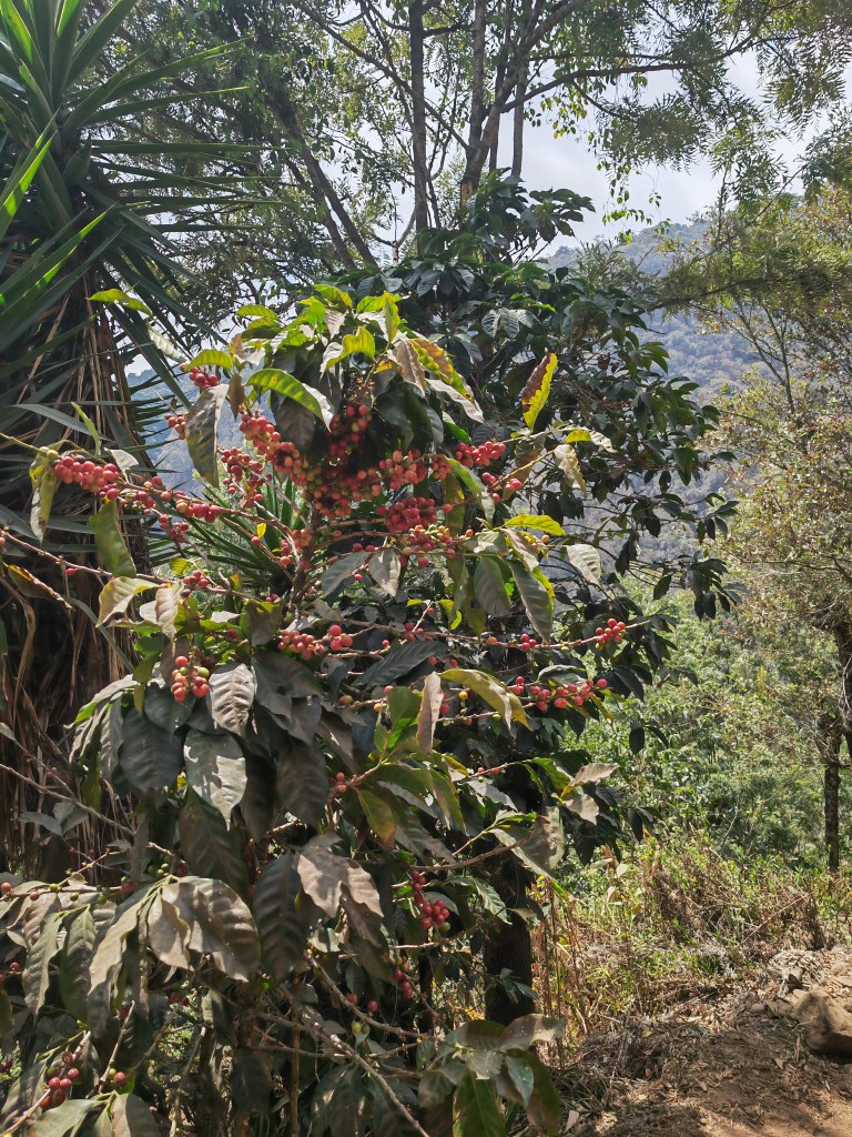 C’est raide, très raide, au milieu des caféiers où parents et enfants cueillent les précieux fruits rouges (jaunes parfois). Après il faut remonter les gros sacs à dos de cheval ou d’homme. Une caravane d’hommes chargés de plus de 50 kilos chacun nous double gaiement en commentant ces drôles de dames entre deux âges qui marchent juste pour le plaisir (un concept plutôt inconnu ici !)