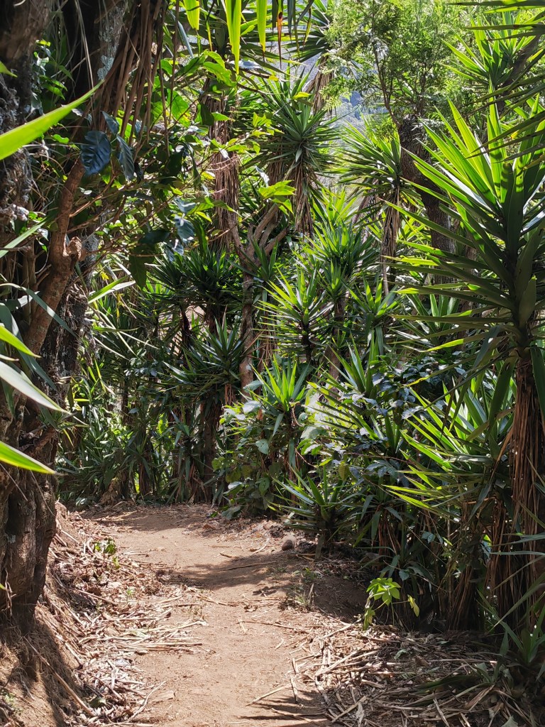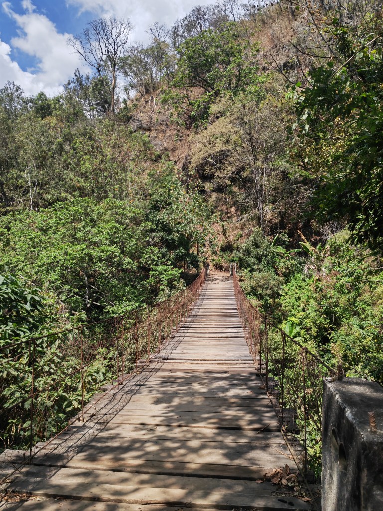 Au fond du vallon, un pont suspendu permet de traverser la rivière. Je n’aime pas ça !! Mais bon, il y a suffisamment de végétation pour masquer l’impression de vide. Nous avalons quelques oranges cueillies à même l’arbre pour reprendre des forces : il va falloir remonter !