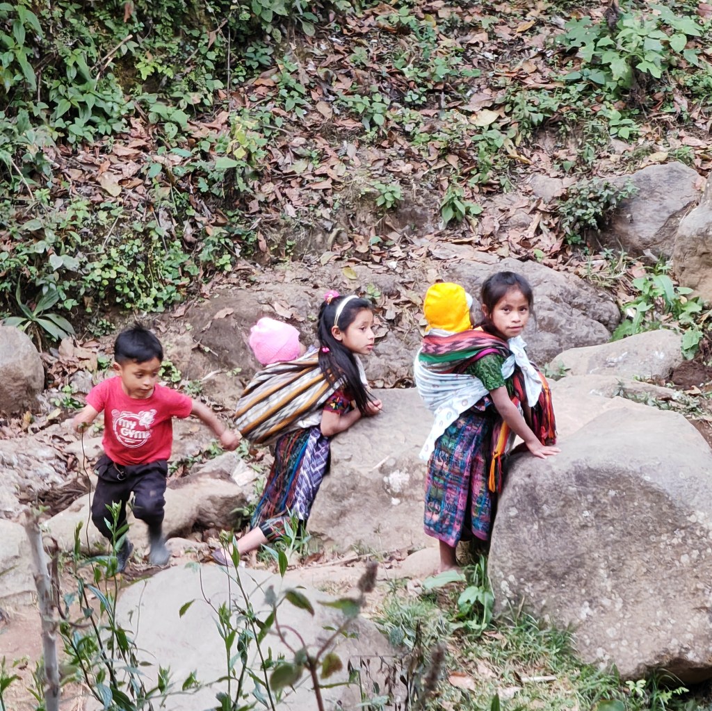 Nous arrivons au village de Las Pilas (les lavoirs), les boissons fraîches de la tienda locale sont plus que bienvenues. Encore 15 minutes de marche avant de faire halte pour le déjeuner… nous sommes accompagnées par des jeunes filles qui rigolent sous cape et se laissent photographier avec les gringas. Des fillettes jouent en portant leur petit frère ou sœur dans le dos pendant que les mères s’activent à la lessive dans le lit de la rivière.