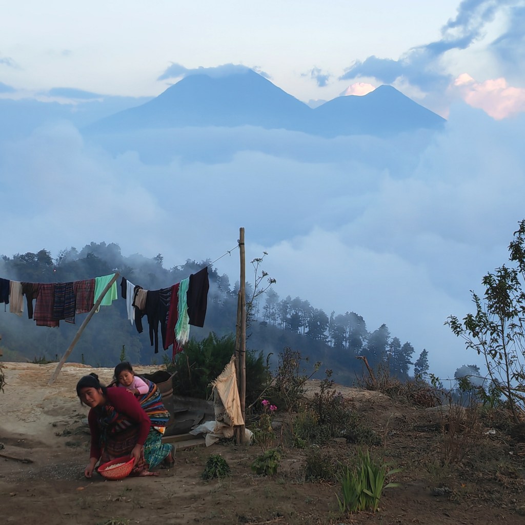 La pente prend des allures de ravin, la température augmente de quelques degrés. Nous croisons une (jeune) femme chargée d’un gros ballot de buchettes de bois en haut duquel est juchée une toute petite fille, elle tient par la main un petit garçon. A bien des égards, la vie rurale guatémaltèque rappelle le Maroc. Autre latitude, même rudesse du travail aux champs, même âpreté du quotidien, même poids de la religion et des traditions sur les femmes en particulier qui sont souvent mères dès 15 ans.