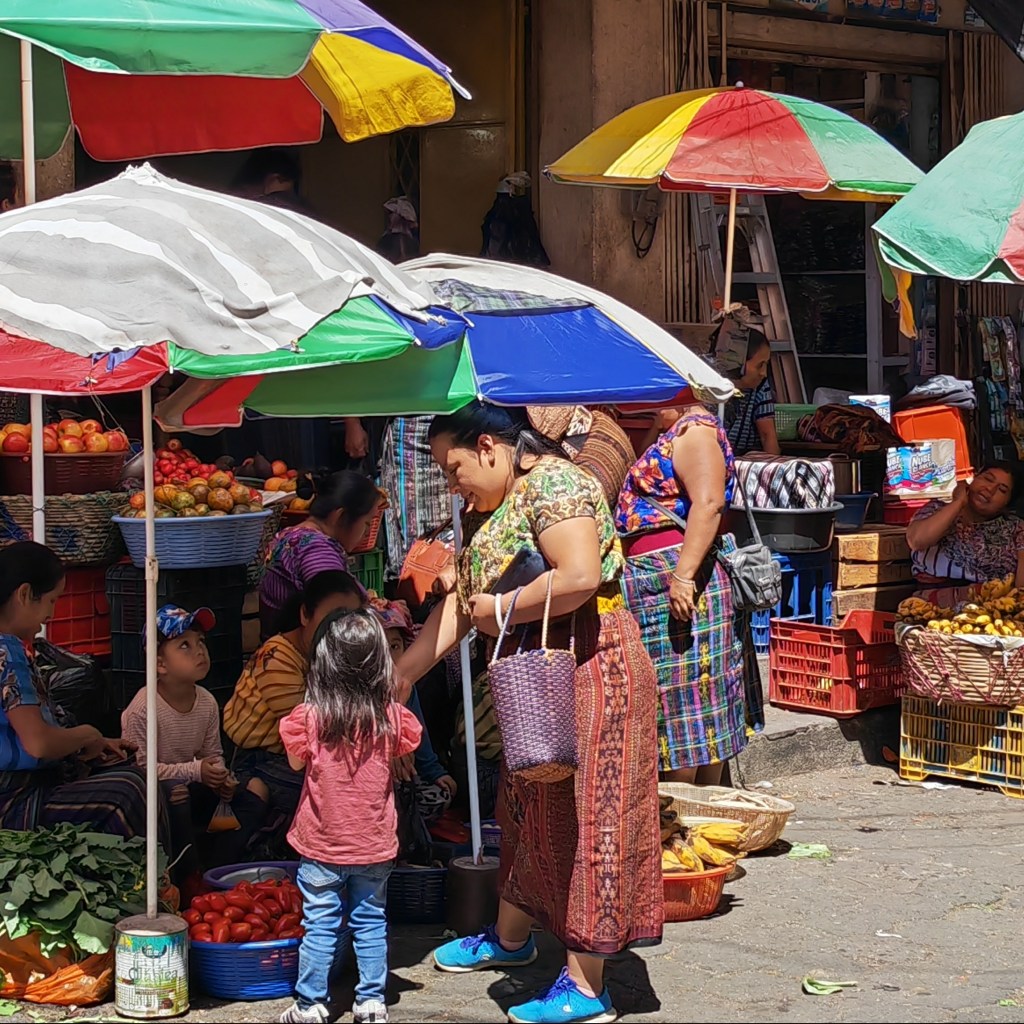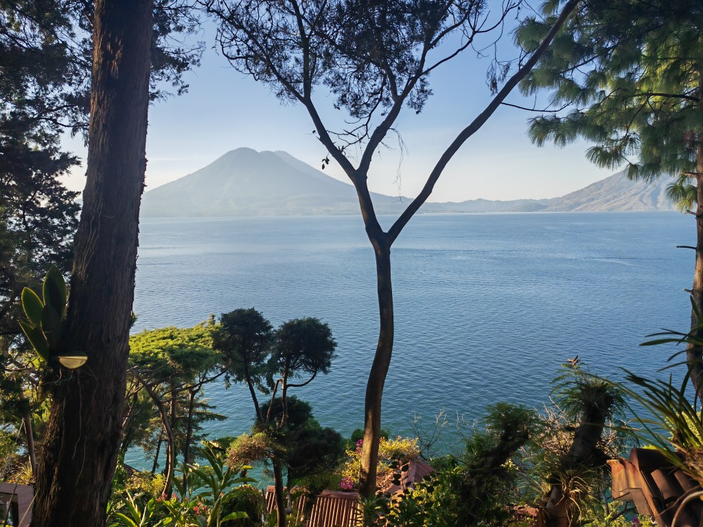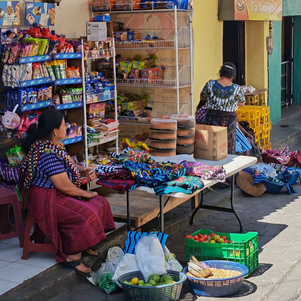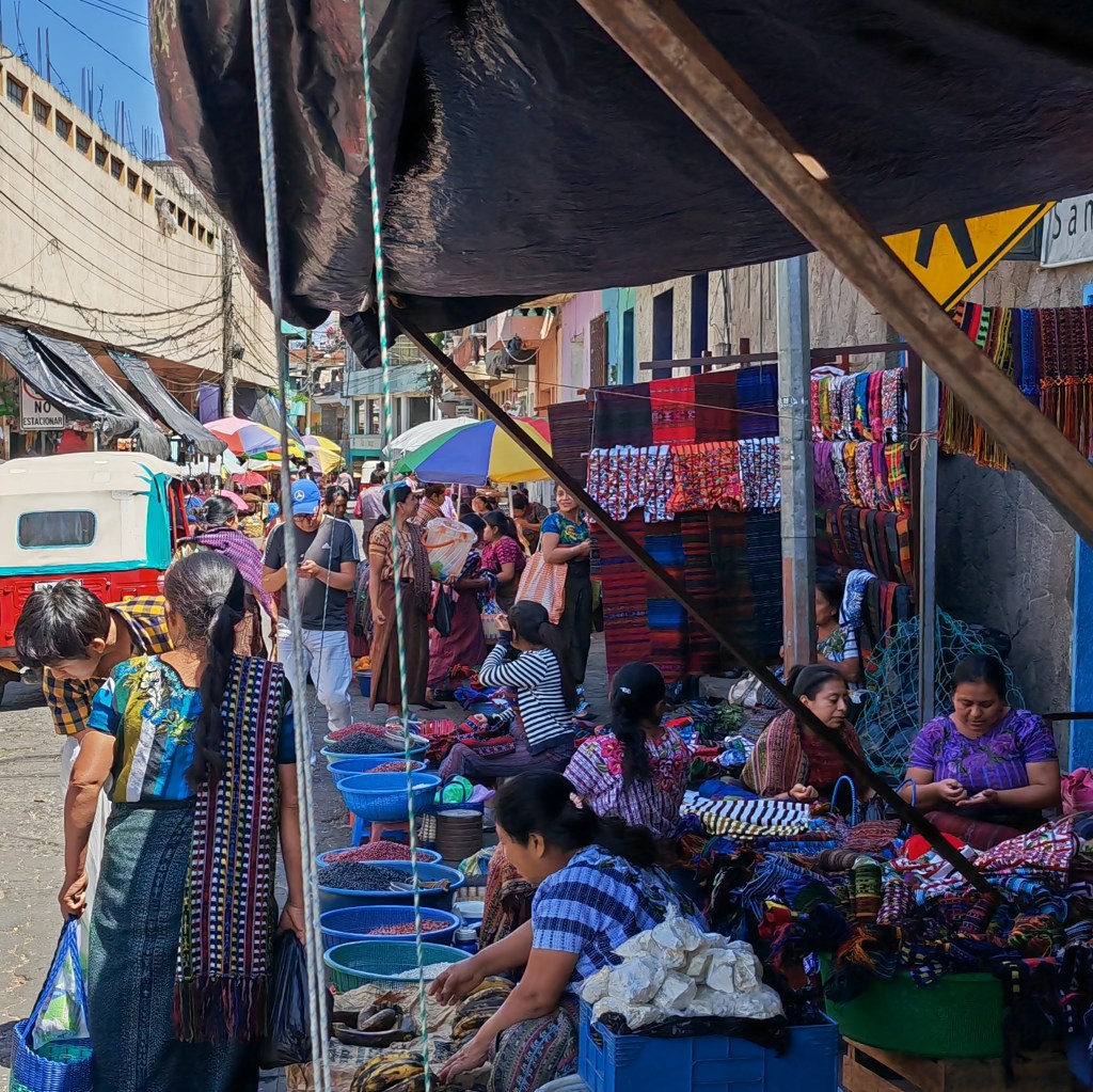 C’est absolument magnifique, une impression de plénitude, de calme, de luxe et de volupté. Petit déjeuner en terrasse ambiance dolce vita avant de partir en bateau pour la petite ville de Santiago Atitlan, une communauté du lac chargée d’histoire et de traditions. Nous sommes accueillies par Lola, une jeune femme qui propose des visites « authentiques » de la communauté. Nous sommes assaillies de vendeuses et vendeurs de tous poils dès notre arrivée… il faut s’éloigner du port et de la rue « touristique » pour trouver un peu de calme.