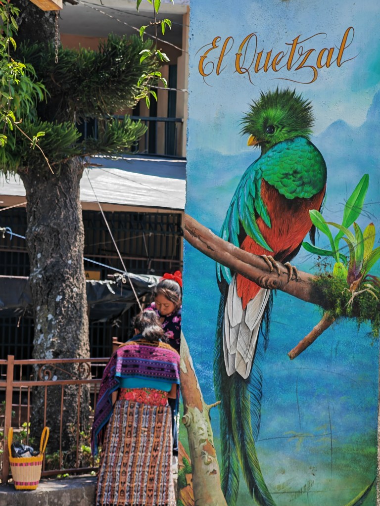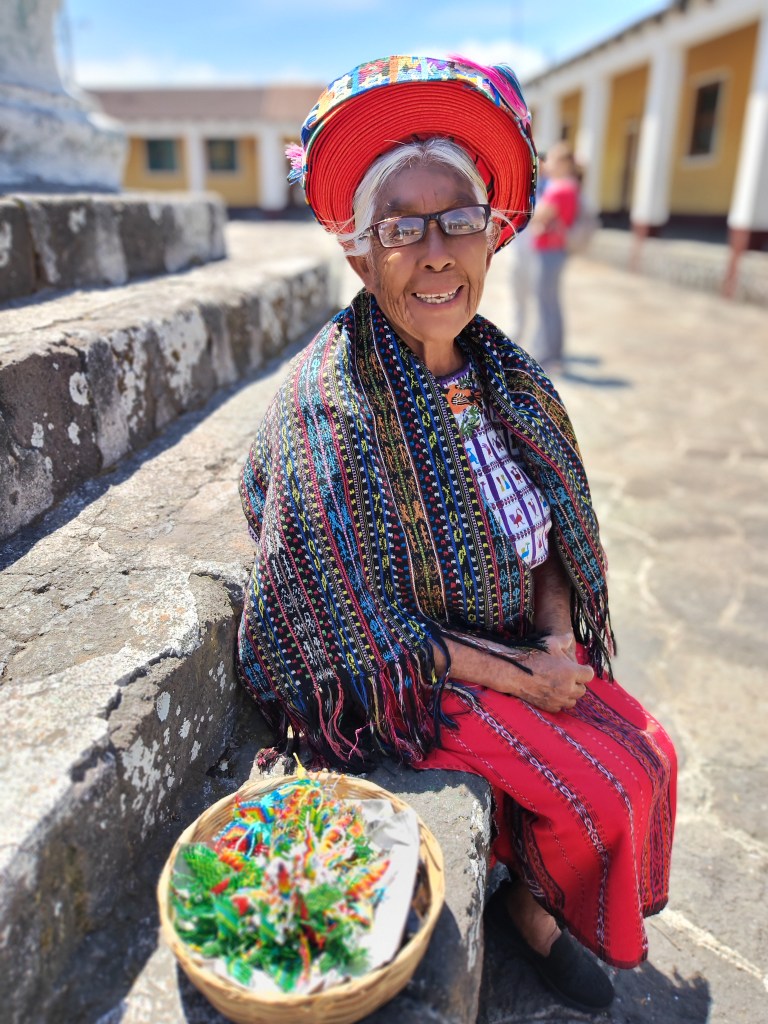 Les hommes ont ici un étrange costume traditionnel constitué d’un pantacourt blanc à rayures violettes orné d’oiseaux brodés. Les femmes âgées arborent une drôle de coiffe : un grand ruban de tissus d’environ cinq mètres de long enroulé sur lui-même sur le haut de la tête, un peu comme une auréole. La pièce de 25 centavos représente d’ailleurs une femme de Santiago Atitlan avec sa coiffure.