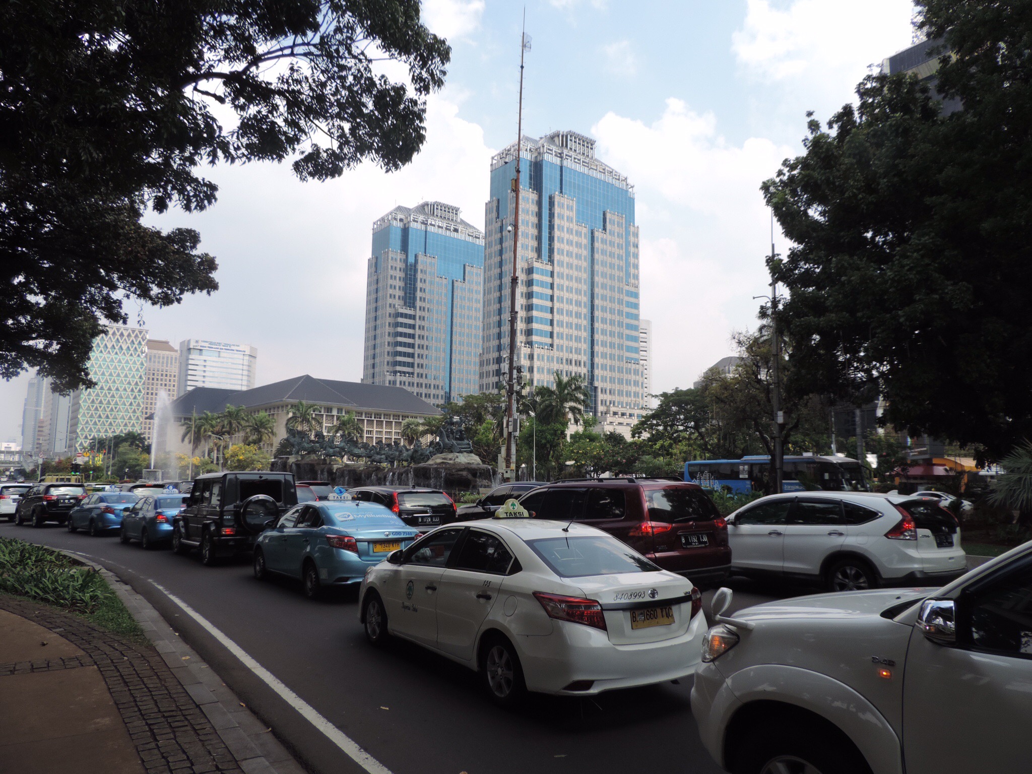 On était prévenus, mais optimistes et prêts à se laisser surprendre en bien par Jakarta… pas de surprise !!! La ville est bien telle qu’on nous l’avait décrite : tentaculaire, étouffante, odorante, polluée et surtout absolument impossible à découvrir à pied. La circulation est dense, erratique et totalement irrespectueuse des piétons.