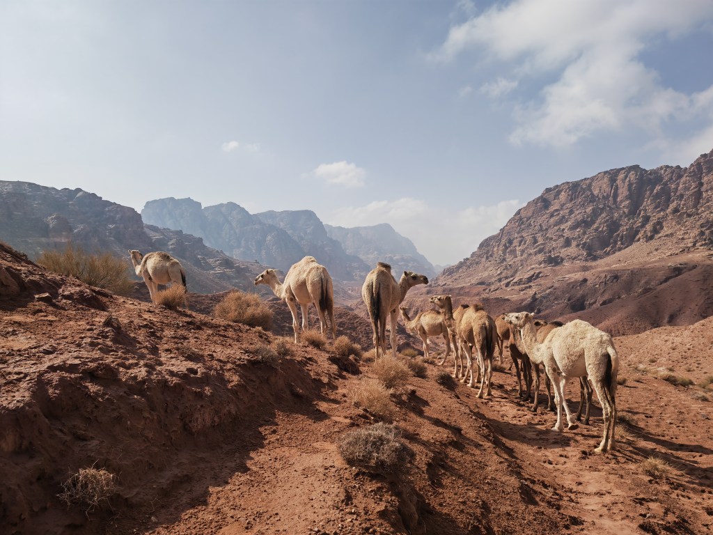 Rapidement, nous rejoignons le sentier de Wadi Sabra. Le paysage est grandiose, immense. Nous admirons le panorama sur le mont Aaron. Nous sommes seuls, tout juste quelques troupeaux de grandes chèvres noires au poil très long. Au détour d’un petit col nous croisons un beau troupeau de dromadaires menés par une femelle imposante à l’air sévère. On se demande un peu ce qu’ils trouvent à manger dans cet univers très minéral.