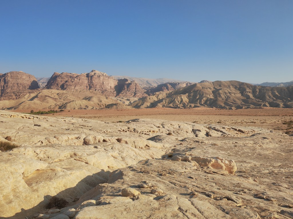 La journée est magnifique, mais un peu longue pour mes jambes déjà douloureuses après les escaliers de Petra. Nous arrivons à proximité d’une petite ferme sur des replats de roche claire traversées de fissures étranges presque géométriques.