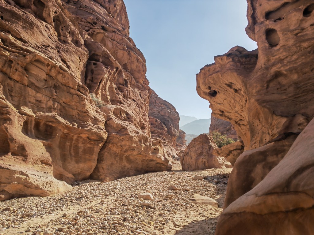 Nous descendons ensuite vers le vallon un peu plus verdoyant où nous pique-niquons dans un petit théâtre creusé à même la roche comme celui de Petra. C’est l’un des vestiges de l’ancien village de Sabra dont on devine quelques bâtiments enfouis sous le sable et les sédiments. Il reste encore tellement à découvrir à Petra et dans les alentours ! Une famille de bédouins nous invite à prendre le thé à l’ombre d’un petit acacia, nous refusons… ce n’est pas bien mais nous venons de manger et la route est encore longue.