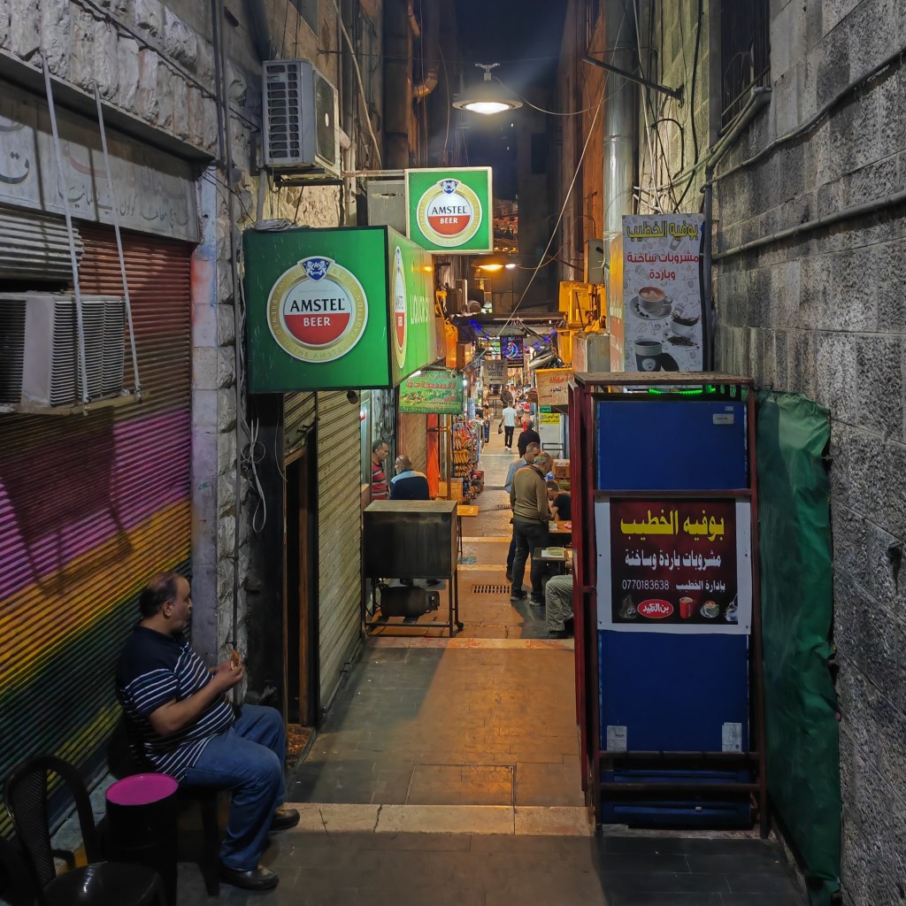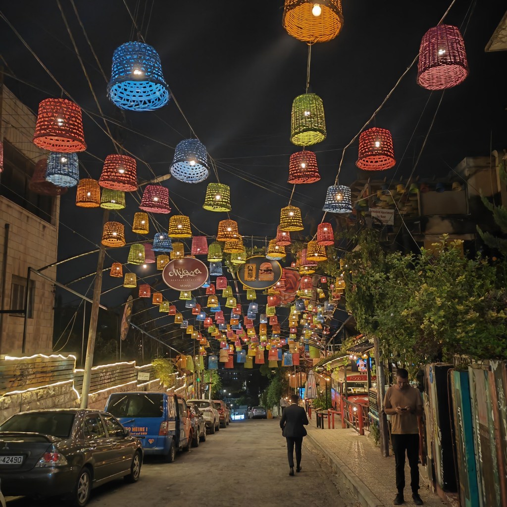 La découverte commence sur Jabal Amman, le 1st circle et Raimbow street, rue branchée joliment éclairée de lampions, pleine de petits restaurants bobo et de concept stores. L’ambiance est détendue. La nuit est tombée sur downtown, mais l’activité est toujours intense, les familles déambulent parmi les bazars et les petits restaurants tout en évitant la circulation intense de l’avenue.