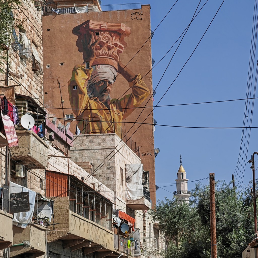 Le lendemain, nous déménageons sur Jabal Weibdeh, changement d’ambiance : les petites rues proprettes sont bordées de jolies maisons et de jardins fleuris. Il y a des petits restaurants, des librairies des commerces de produits bios et même le rond-point de Paris décoré d’une colonne Morris et de quelques bancs et réverbères échappés du jardin du Luxembourg.