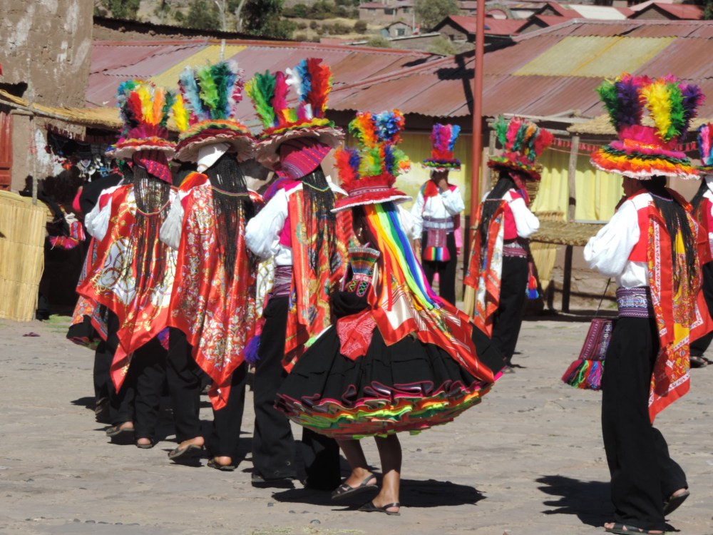Le lendemain, nous quittons notre hôtesse et reprenons le bateau pour l’île de Taquile à une heure de navigation. Nous accostons dans un port de poche et montons jusqu’à la place principale où malgré l’heure matinale, le festival en l’honneur de Santiago bat son plein : musique et danses traditionnelles sous l’œil des autorités assises en rang d’oignon devant la mairie…
